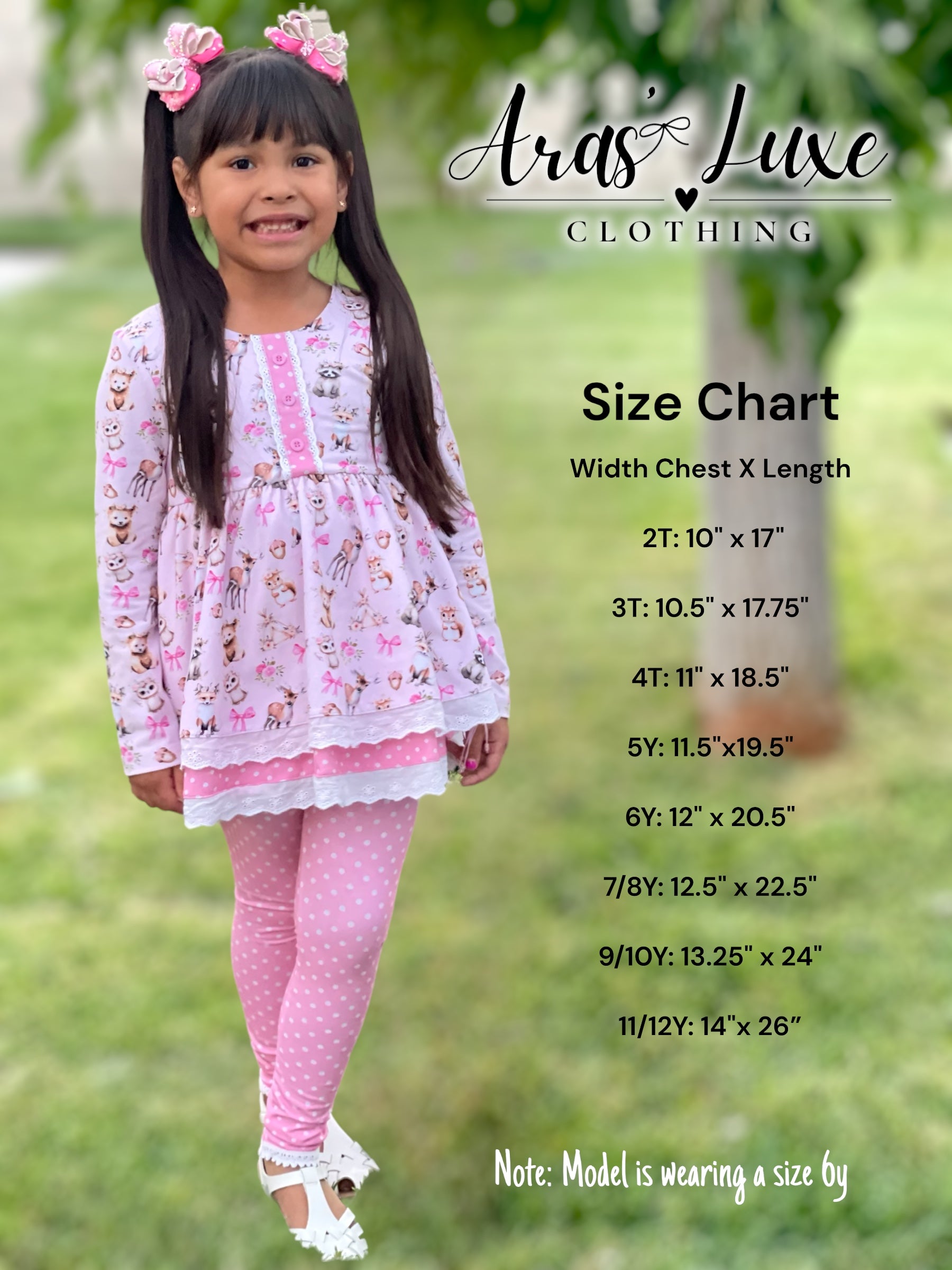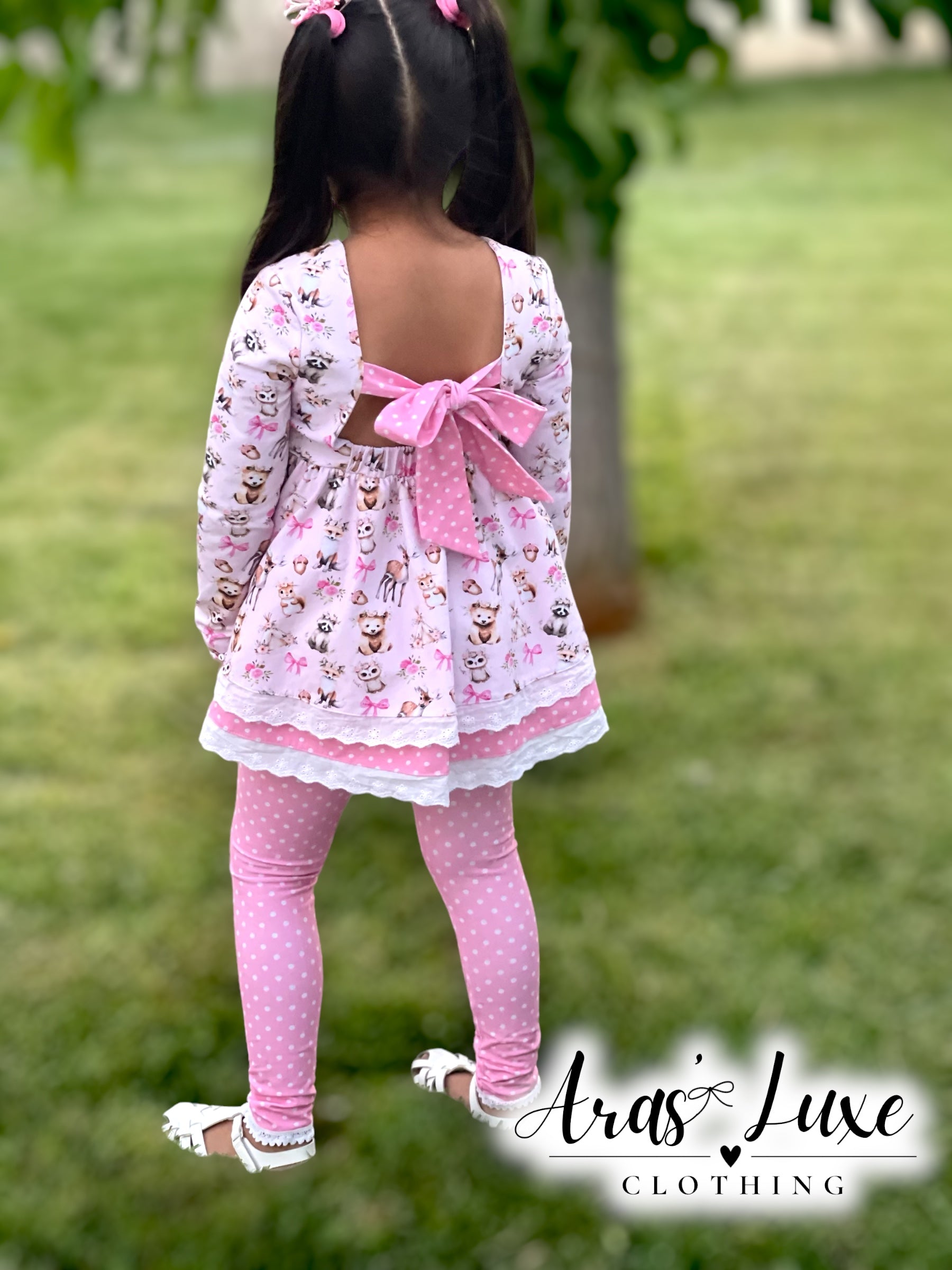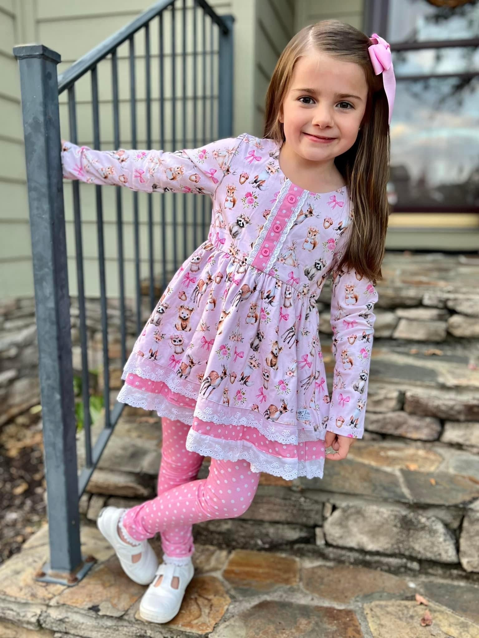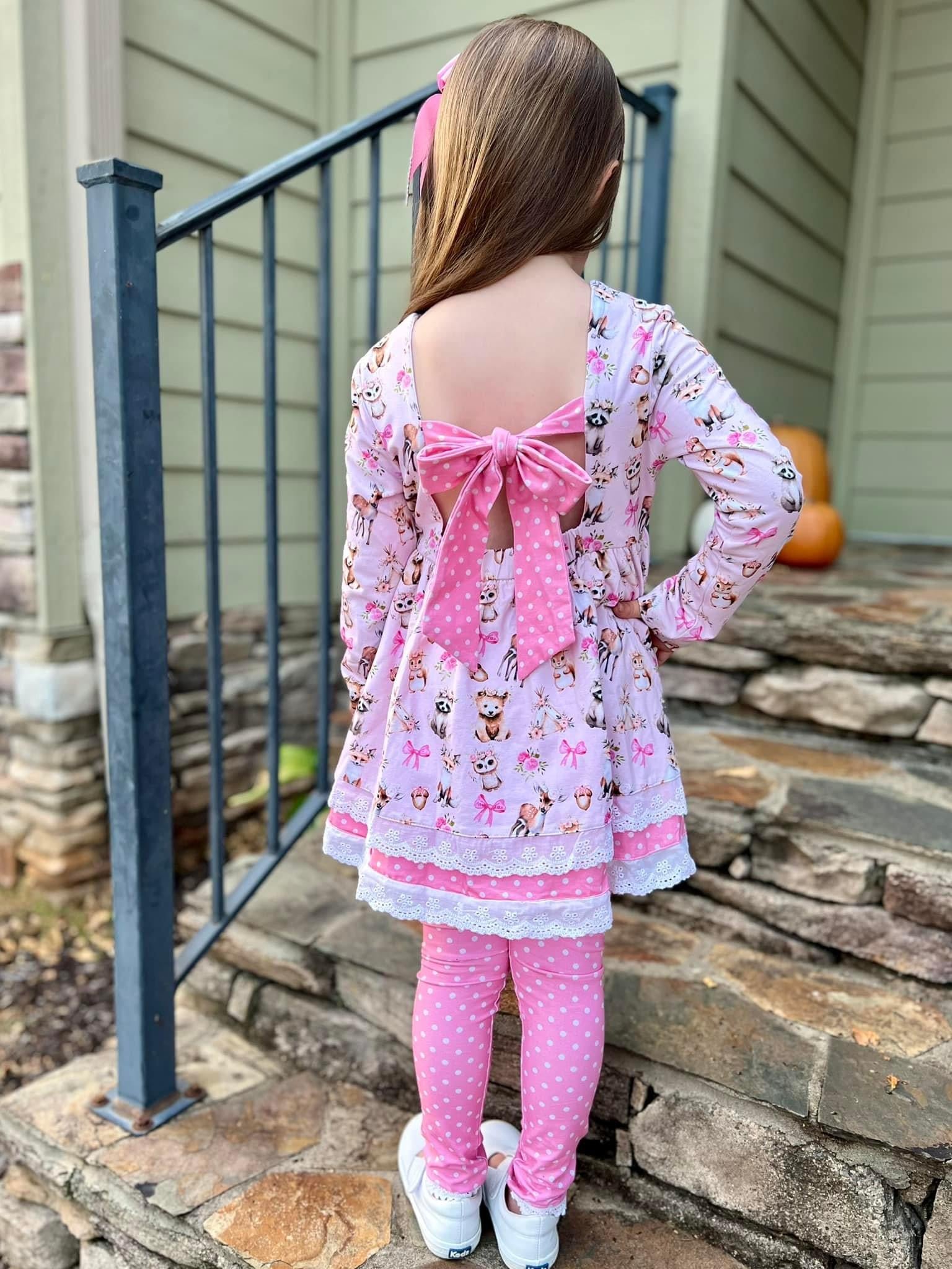 Made from high quality cotton/spandex blend. This beautiful tunic dress features a beautiful woodland animals print designed in house and polkadot print details. It also has three beautiful pink buttons as decoration and a beautiful bow on the back that needs to be tied.