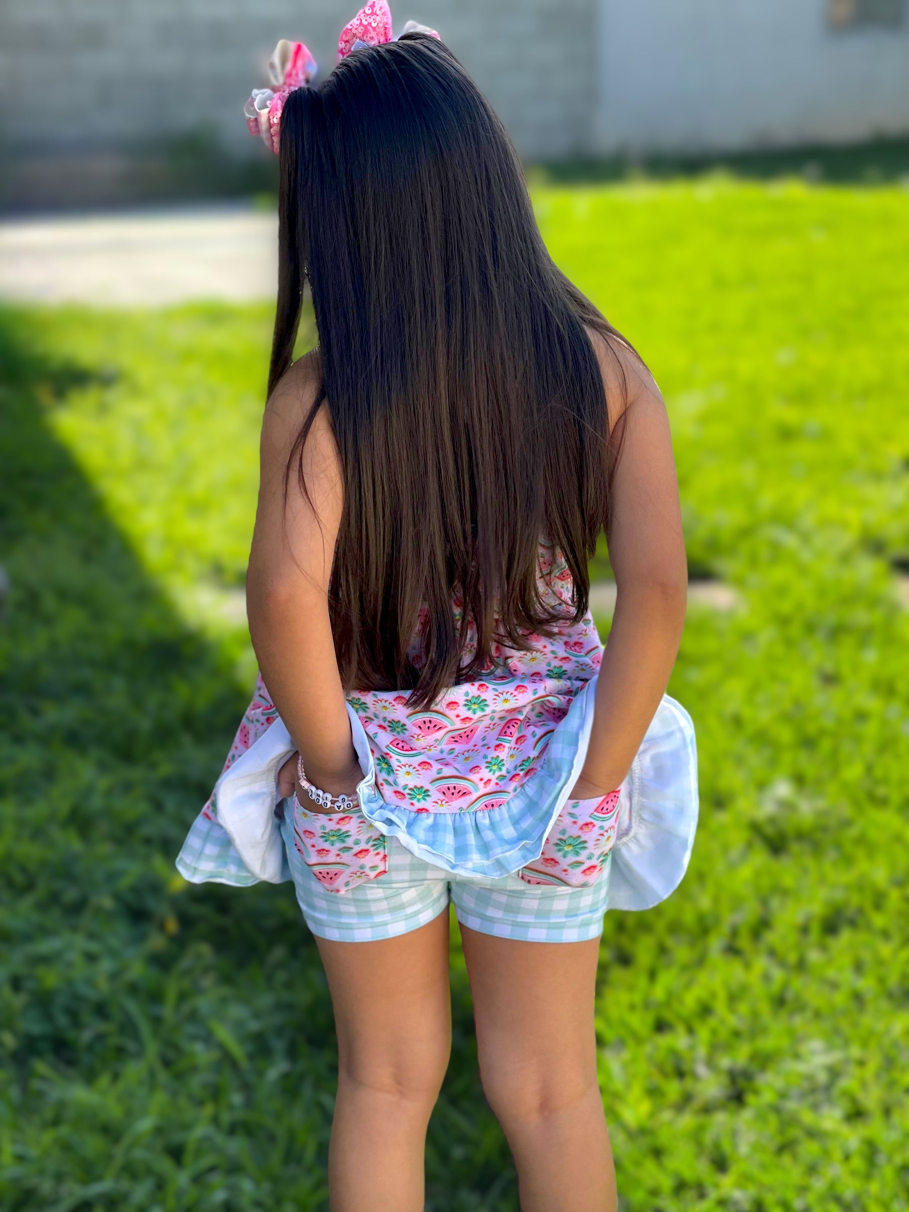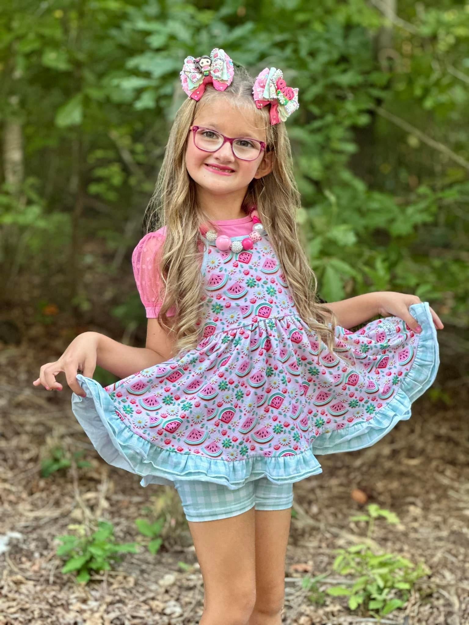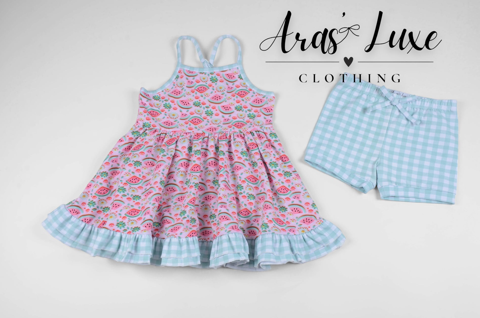 Made from high quality cotton/spandex blend. This beautiful adjustable spaghetti cross back tunic features a beautiful 3D watermelon print and green gingham print details. The shorties are included with all sizes. The shorties come with a bow in the front and two compliment print pockets on the back that match the dress print.