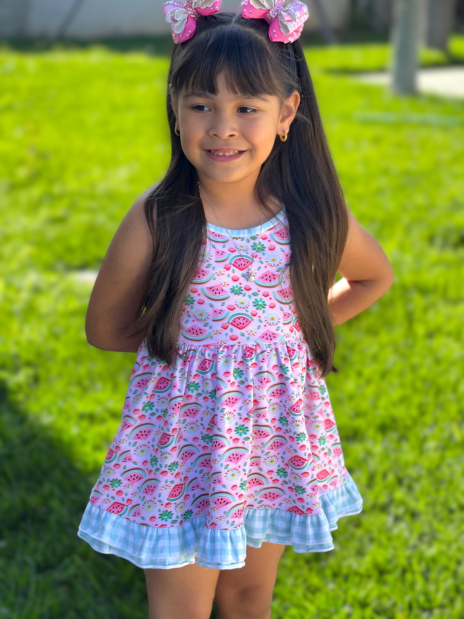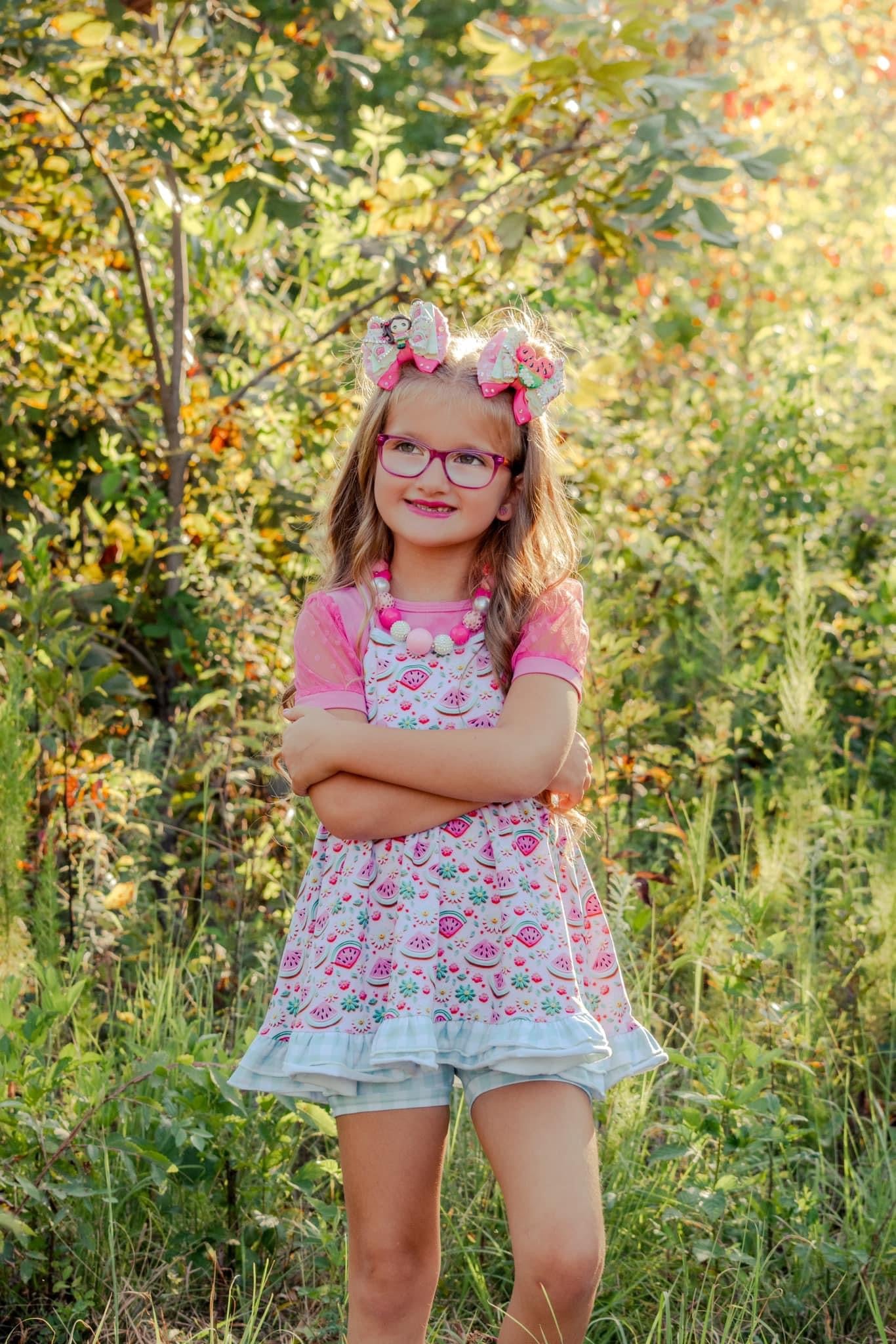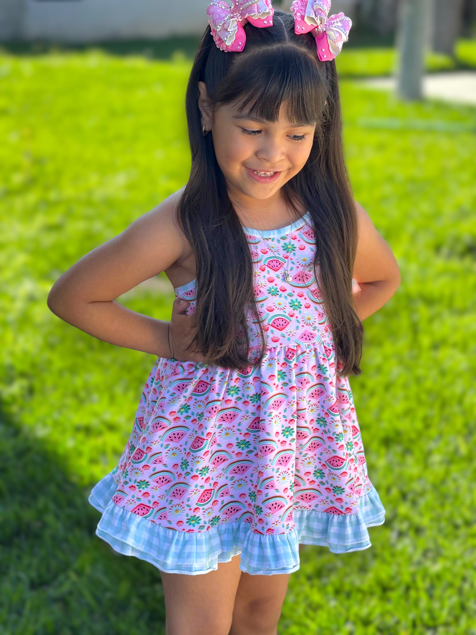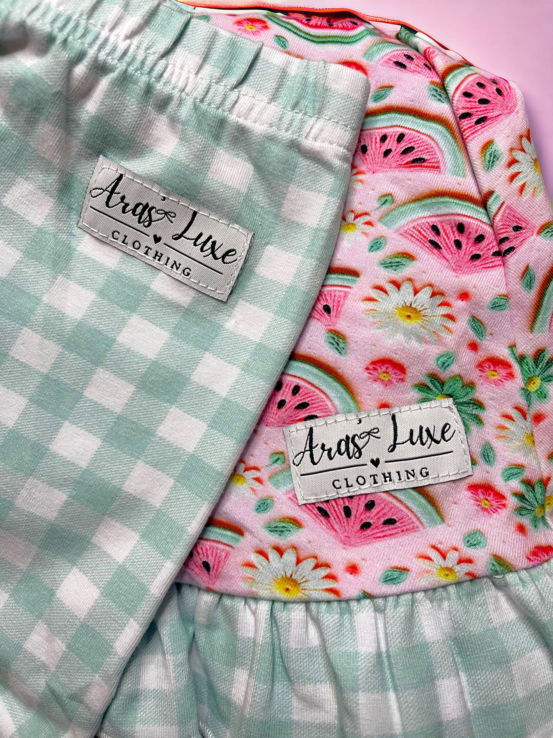 Made from high quality cotton/spandex blend. This beautiful adjustable spaghetti cross back tunic features a beautiful 3D watermelon print and green gingham print details. The shorties are included with all sizes. The shorties come with a bow in the front and two compliment print pockets on the back that match the dress print.